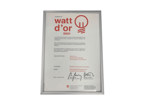 On January 7th, the Watt d'Or was awarded for the 14th time. In the “Energy-Efficient Mobility” category, the Association pro H2 Mobility Switzerland, of which Tamoil SA is a member, was chosen as the winner. Together with Hydrospider AG, Hyundai Hydrogen Mobility AG and H2 Energy AG, the H2 Mobility Switzerland association is expanding the world's first commercial cycle for renewable hydrogen in Switzerland.