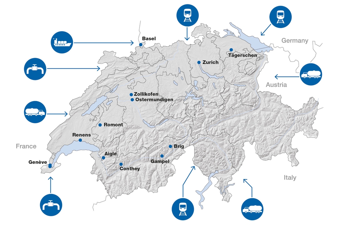 Les carburants et combustibles destinés au marché de gros comme au commerce de détail sont acheminés en Suisse au travers de canaux d’approvisionnement diversifiés.